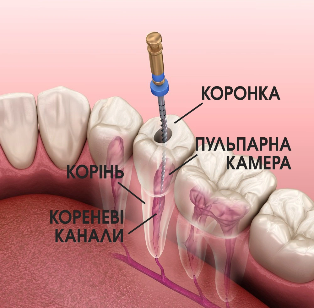 - Стоматолог створює доступ до пульпарної камери через небну або язикову поверхню (для передніх зубів) або через жувальну поверхню (для молярів та премолярів).